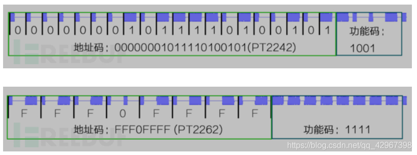 PT2242信号:前面4bit表示同步码,中间的20bit表示地址码,后面的4bit表示功能码,最后一位是停止码。