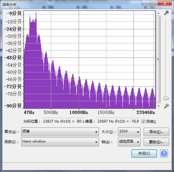 下载得到无后缀名文件,file命令判断是wav音频文件。重命名后audacity打开,波形和频谱均无可疑线索。选择“分析-频谱分析”: